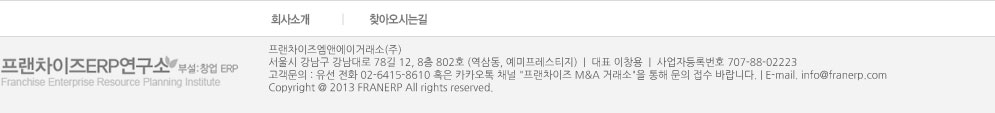 문의사항 있으시면 아래 연락처로 말씀 부탁드리겠습니다. 딜 담당자 : Alice (한국공인회계사) 이메일 : alice@franerp.com 연락처 : 010-8352-8611